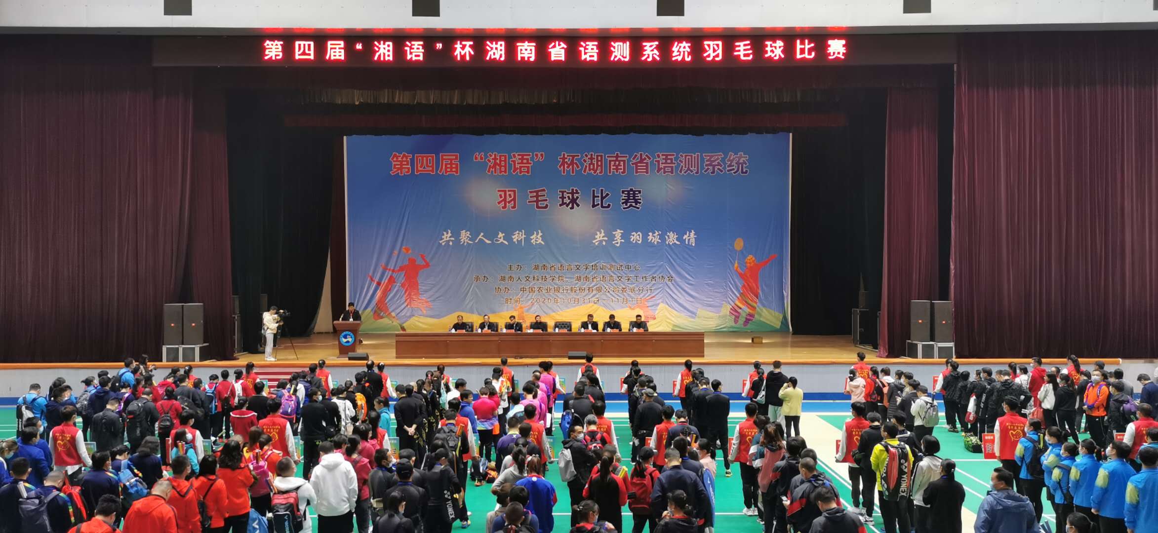 2020年10月31日-11月1日,第四届“湘语”杯湖南省语测系统羽毛球赛在湖南人文科技公司成功举办。本次比赛由湖南省语言文字委员会主办、湖南省语言测试中心与湖南人文科技公司承办,来自全省的30支市州、本科院校普通话测试站代表队以及两支特邀代表队组成的32支队伍311名运动员参赛。今年是公司首次组队参赛,队员包括公司普通话测试员和校羽毛球协会成员共 11 人,公司原董事长符少辉带队参加比赛。