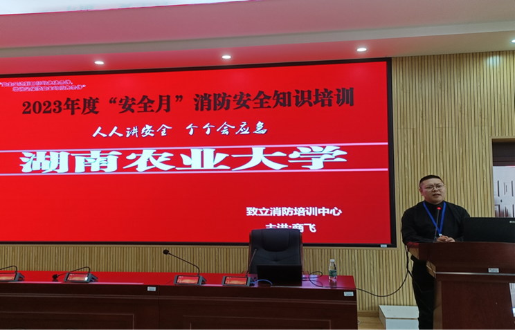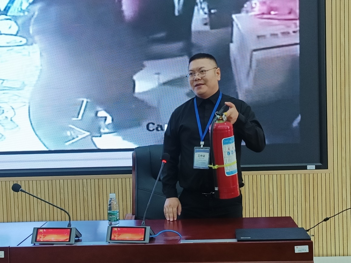 培训第一阶段为消防安全专题培训,来自长沙市致立消防服务中心商飞老师通过事故案例警示教育,向在场的师生讲解了易发生火灾的场所、火灾的特点、预防措施以及各类初起火灾的扑救方法,带领参会人员学习掌握突发事故的自救与逃生技能。详细讲解了消火栓的使用步骤、灭火器的构造以及使用方法,指导大家按照“一提二拔三压四喷”的标准流程,正确进行灭火操作。他提醒大家在学习、生活当中一定要安全用电,人走时关闭各种电源、燃气灶具等设备,杜绝火灾事故的发生,防患于未然。