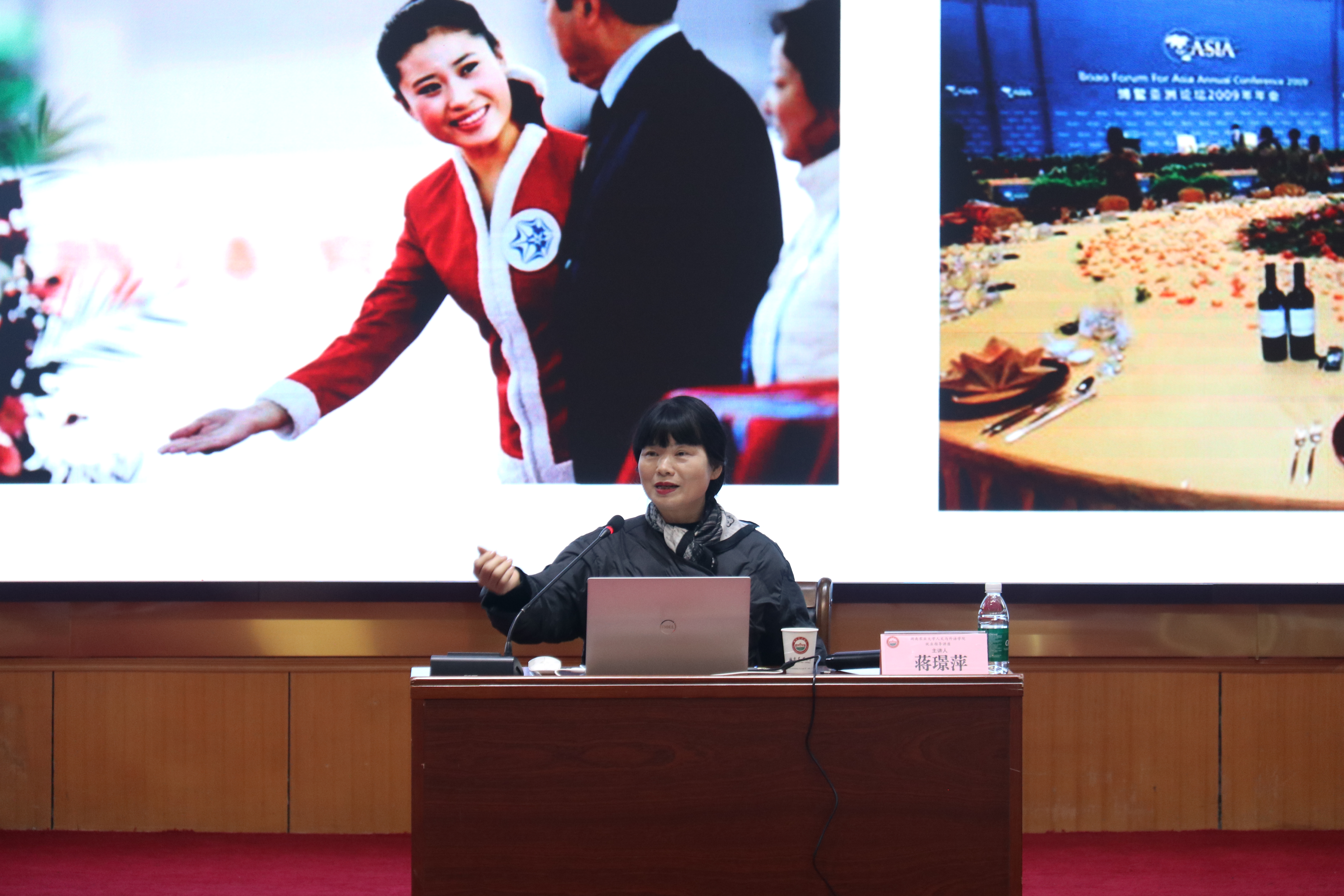 在阐述礼仪的具体实践时,蒋教授聚焦“仪式礼仪、会议礼仪、接待礼仪”三大公务礼仪类型,指出其背后蕴含的政治意义与社会功能。她特别强调“言行举止”在个人修养外化中的关键作用,提出“服饰得体、体姿合宜、语言礼貌”是践行礼仪精神的三大支柱,并引用宋代郭若虚“气韵生动”之说,阐明外在举止与内在修养的统一关系。 为增强指导的实用性,蒋教授结合具体场景进行演示:体姿方面,详细讲解坐姿、站姿、走姿的规范要求,并配图展示标准式、侧点式、前交叉式等标准姿态;着装方面,深入解读TPO原则(时间、场合、身份),通过图示说明职业女性裙装禁忌与男士西装搭配规范;场景礼仪方面,具体说明电梯使用中“尊者优先”、乘车座次安排、餐宴位次排列等细节规范,并配图展示主位排序逻辑 。