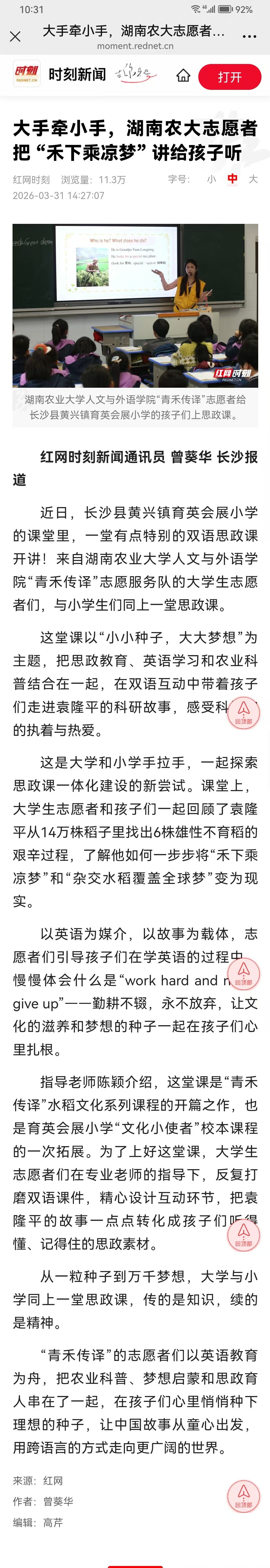 【红网时刻】大手牵小手,湖南农大志愿者把 “禾下乘凉梦” 讲给孩子听