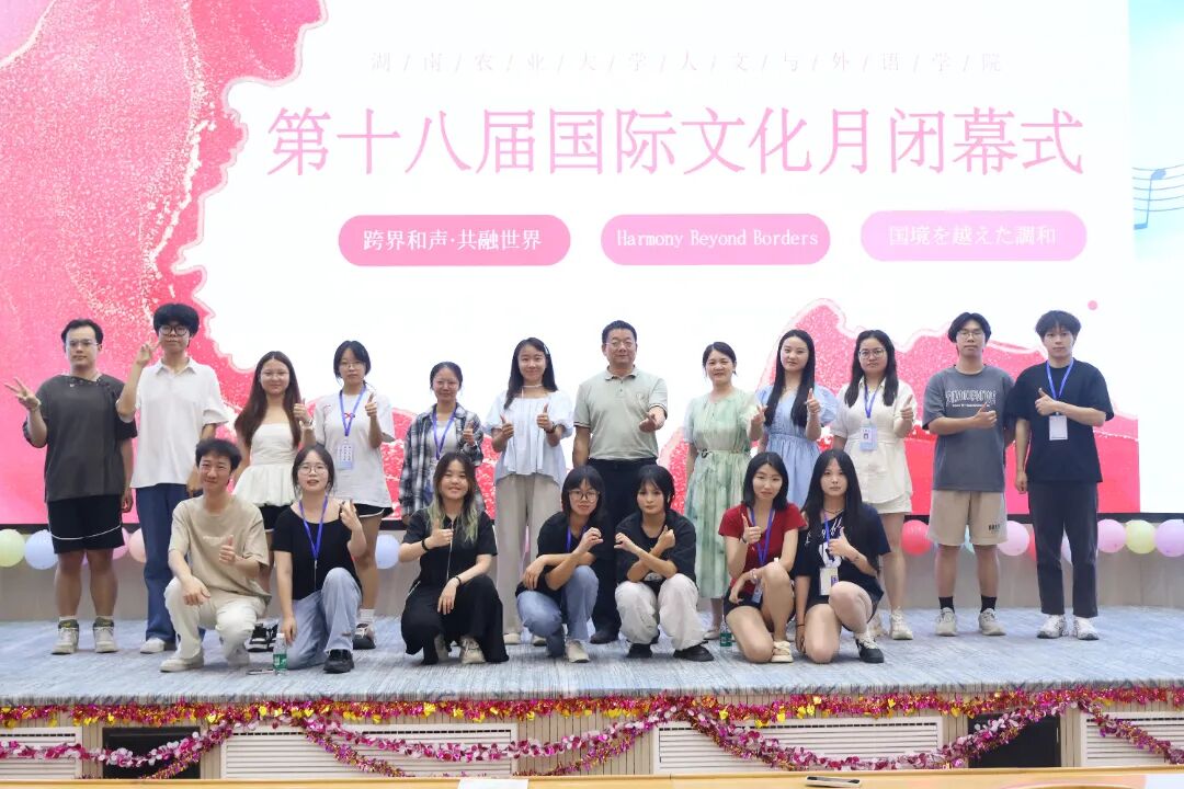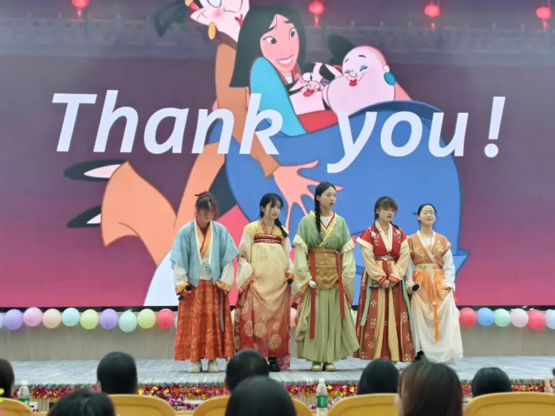 “声动寰宇”板块同样精彩纷呈,中文话剧《万山红遍》讲述赵亚夫助农实践,展现乡村振兴故事;日语演讲《もしも私はインフルエンサーになったら》探讨新媒体时代的个人价值,尽显语言功底;英语戏剧《耒耜》用英文展现古老耕作智慧的传承魅力。最后歌曲串烧点燃全场,晚会圆满落幕。